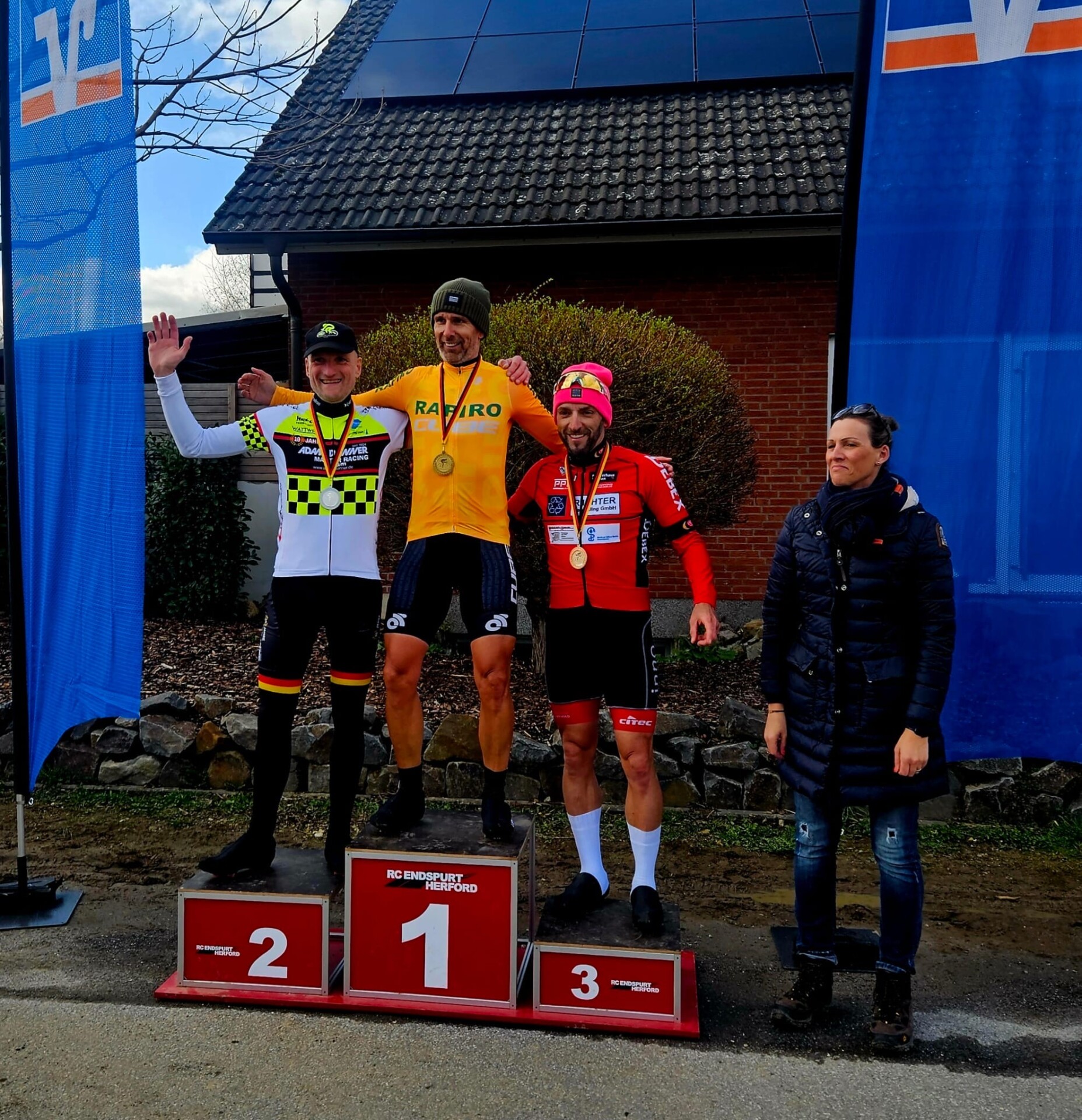 Eine Woche nach dem Team-Trainingslager auf Palma de Mallorca ging es für André Barth vom OSC-Cyclingteam nach Herford zum Frühjahrsklassiker. Schon bei der Startaufstellung war die Anspannung groß, erst die Master 2 mit über 40 Fahrern und direkt dahinter weitere 40 Fahrer der Master 3 Klasse. Der erste Gedanke von André, „wie komme ich hier schnellstmöglich nach vorn“. Step by step und Runde für Runde konnte sich André unter den Top 15 Fahrern einsortieren. Zum Finale hin (letzten 2 Runden) reihte sich André in die 3. bis 6. Position ein, um eine gute Ausgangsposition für einen Zielsprint zu bekommen. Gesagt, getan, am Ende Platz 3, hinter Mario Carl und Rainer Beckers.